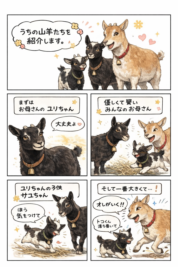 ホームページの制作に取り組んでるキッカケは、生成AIの進歩がすごいから…今までわからなかった事も夜通しきいてくれて、勘違いもあるけど今こうやってワードプレスのサイトが立ち上げられてるのです。農園には牧場から預かっている山羊がいます。お越しになられた方はご存知と思うけど、ちょっと写真からマンガ作ってみましたー!